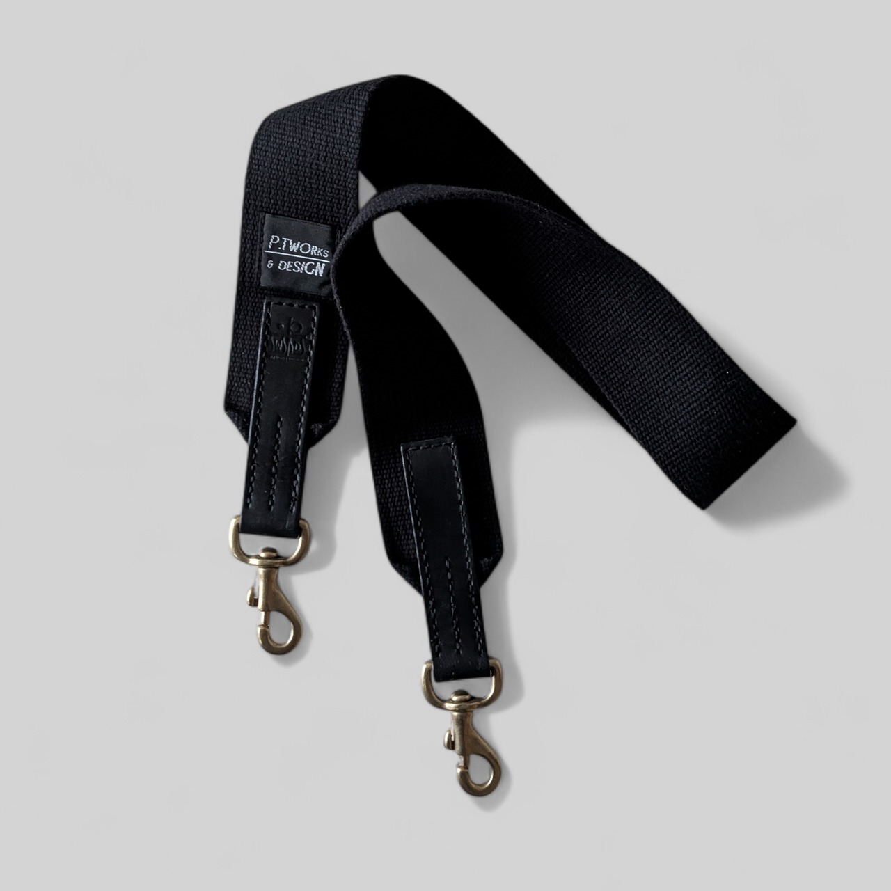 5cm幅の綿テープとレザーのシンプルなストラップ。長さ調節はできません。