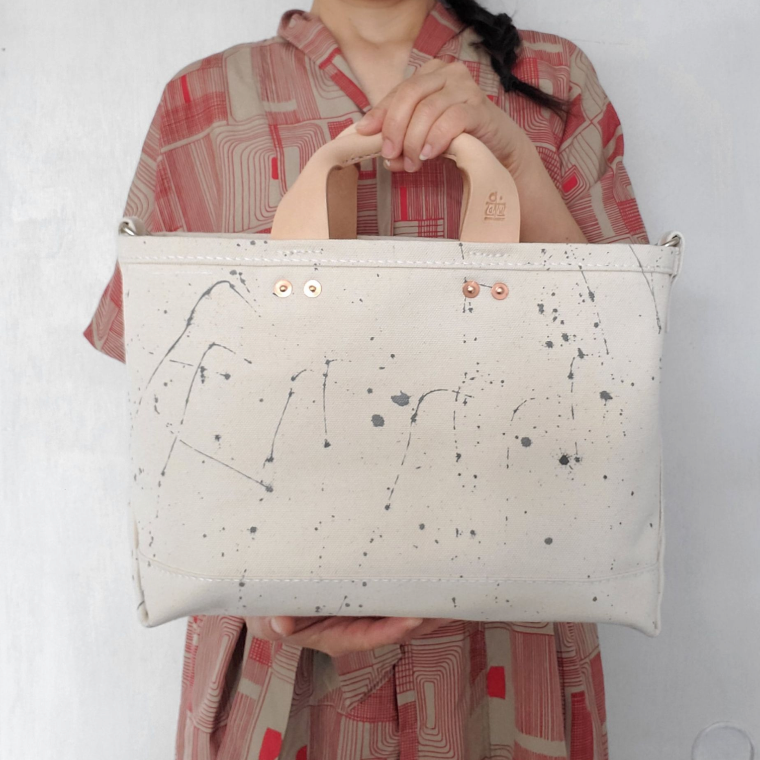 グレーのdropping paint を施したCANVAS で仕立てたTOOL TOTEのS-size です。