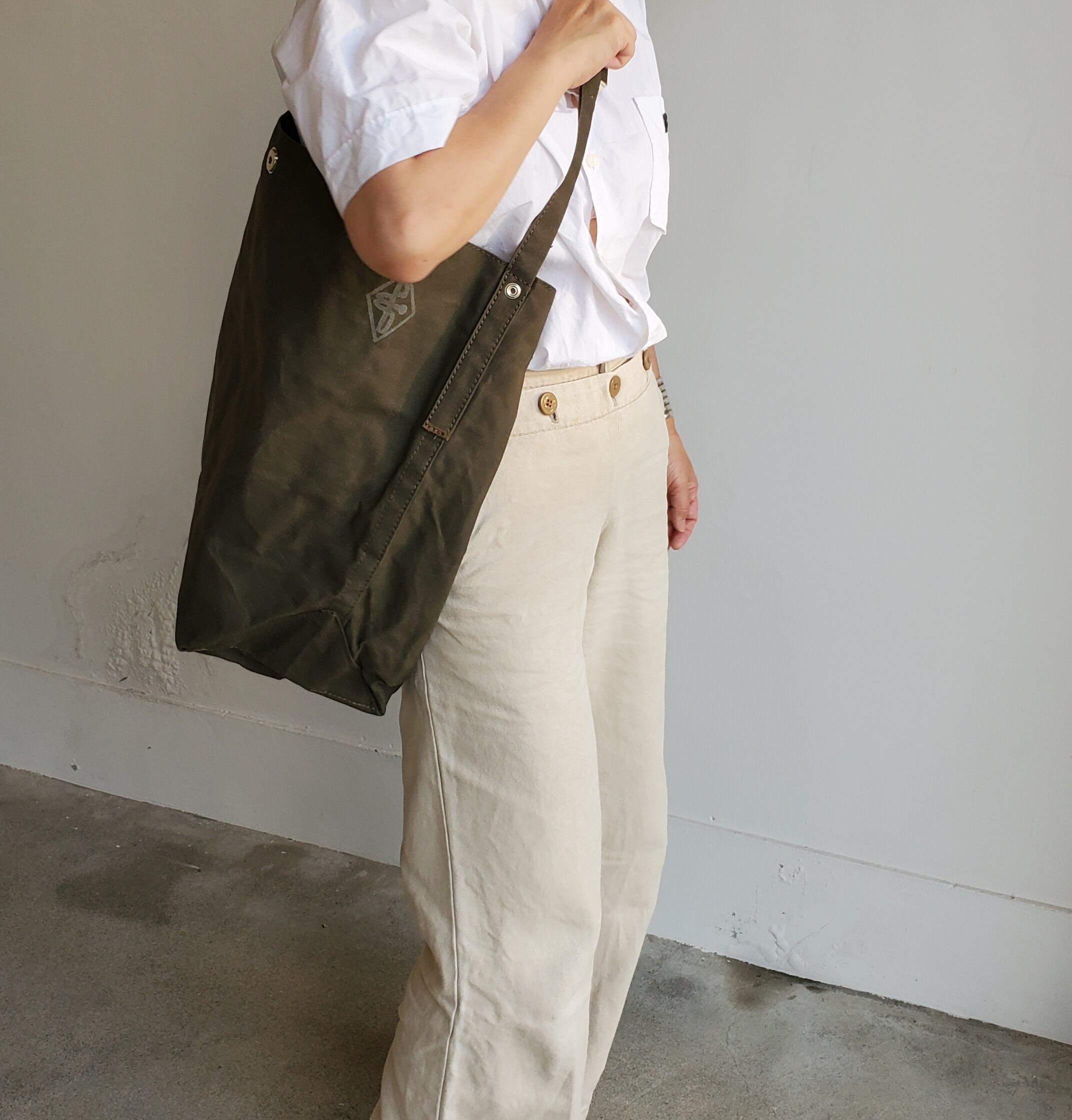 現代の収穫用の袋のイメージのシンプルなショルダーバッグ。パラフィンコーティングしたライトな生地で仕上げました。